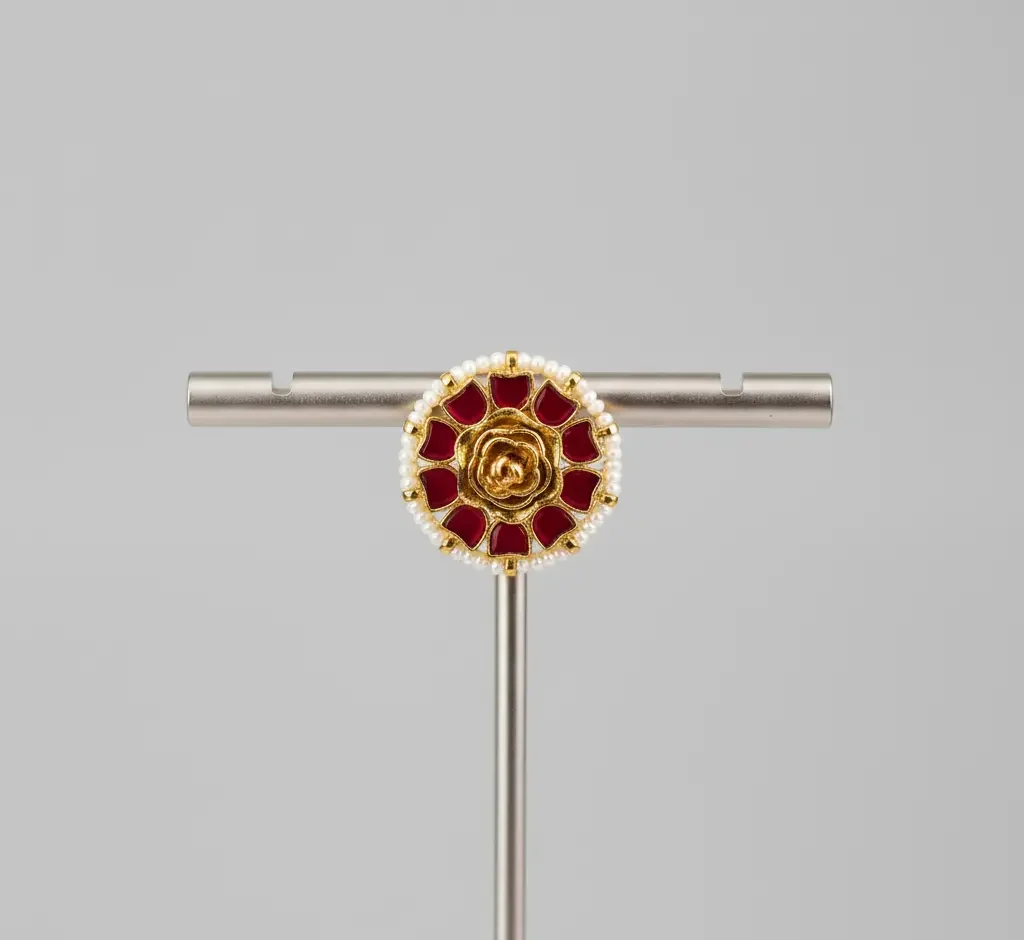 The Red Enamel Floral Stud Earrings are a perfect blend of simplicity and elegance. Designed in a circular form, these earrings feature a vibrant red enamel base adorned with a golden floral motif at the center, symbolizing grace and charm. A fine border of tiny pearls frames the design, adding a touch of delicacy and sophistication. Lightweight and versatile, they are ideal for daily ethnic wear, festive gatherings, or as a subtle complement to more elaborate jewelry. These studs bring a refined pop of color and elegance to any traditional ensemble.
