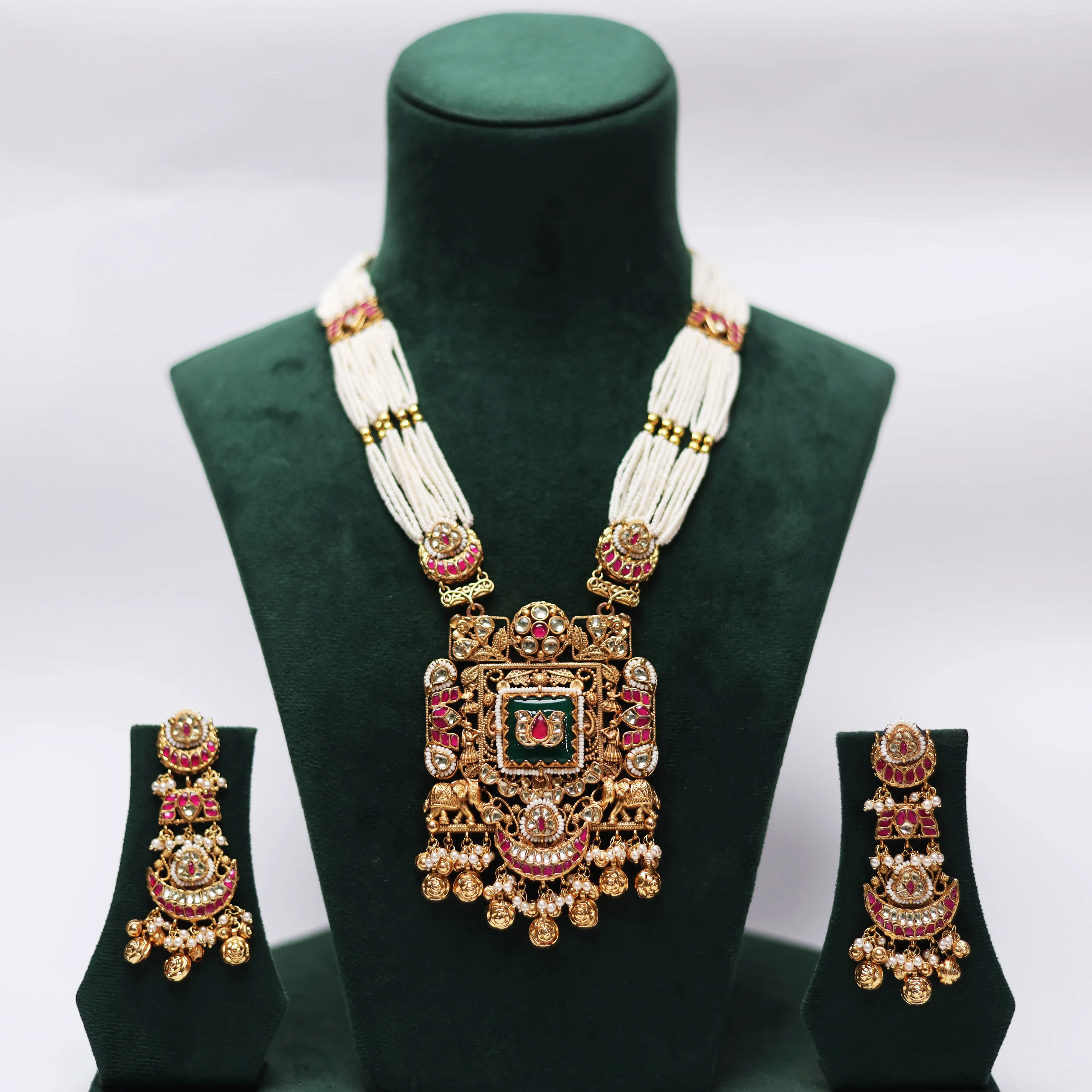 A regal pearl-strand necklace with an ornate temple-style pendant and matching earrings, radiating divine grandeur.